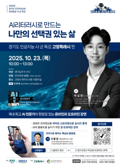 [뉴스노크=김인호 기자] 고양특례시는 경기도와 경기과학원이 주최하는 ‘2025년 인공지능 시군특강(고양특례시편)’을 10월 23일 마두도서관에서 진행한다고 밝혔다.