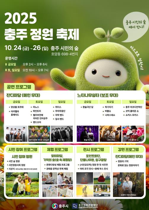 [뉴스노크=김인호 기자] 충주시와 (재)충주문화관광재단은 10월 24일부터 26일까지 3일간 충주 시민의 숲(호암동 698-4번지)에서 ‘2025 충주 정원 축제’를 개최한다고 밝혔다.