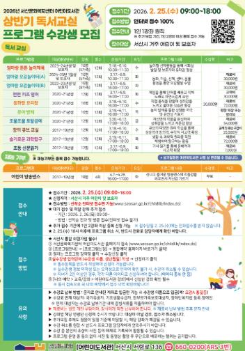 [뉴스노크=김인호 기자] 서산문화복지센터 어린이도서관은 오는 19일부터 ‘2026년 어린이도서관 상반기 프로그램’ 10개 강좌, 수강생 116명을 홈페이지를 통해 선착순 모집한다고 밝혔다.