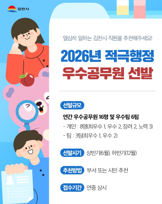 [뉴스노크=김인호 기자] 김천시는 행정서비스 향상과 공익 증진, 사회문제 해결을 위해 2026년도 적극행정 우수공무원을 선발한다고 밝혔다.