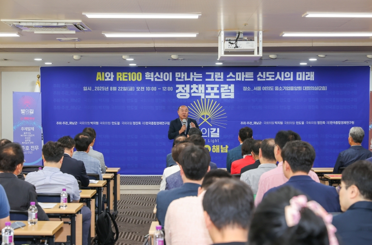 [뉴스노크=김인호 기자] 해남군의회는 8월 22일, 서울 중소기업중앙회에서 열린 ‘솔라시도 AI 에너지 신도시 및 RE100 산업단지 조성 정책포럼’에 참석하여, 신재생에너지 중심의 미래 산업단지 조성과 에너지 신도시 개발을 위한 다양한 논의를 함께했다.