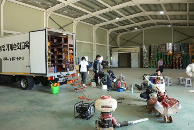 ▲ 나주시가 집중호우로 피해 본 농가 회복 지원을 위해 농기계 임대료를 감면한다. 사진은 지난 7월 30일 침수 농기계 순회 수리 지원 당시 현장 모습. |