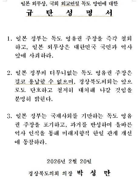 연규식 경상북도의회 독도수호특별위원회 위원장은 “왜곡된 주장 위에 한일 관계의 미래를 세울 수는 없다”며 “일본 정부가 진정으로 우호와 협력을 원한다면 독도에 대한 부당한 영유권 주장부터 즉각 철회해야 한다”고 강조했다. 아울러 “경상북도의회는 독도 수호를 위해 단호히 대응해 나갈 것”이라고 밝혔다.