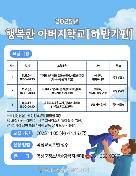 [뉴스노크=김인호 기자] 곡성군청소년상담복지센터가 지역 사회 아버지들(지역 청년회 등)의 요구 분석을 통해 가족 내 소통 역량 증진을 위한 부모교육 프로그램 ‘행복한 아버지학교’ 제10기 참가자를 모집한다고 10일 밝혔다.