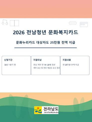 [뉴스노크=김인호 기자] 전라남도는 2026년부터 전남 청년 문화복지카드 사업 추진 시 경제적 취약 계층(기초생활수급자·차상위계층)이 수혜를 받는 문화누리카드 지급자에게도 25만 원 전액을 지급한다고 밝혔다.