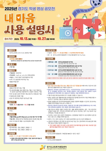 [뉴스노크=김인호 기자] 경기도교육복지종합센터가 경기도교육청 소속 초 중 고등학교 학생들을 대상으로 ‘2025년 경기도 학생 영상 공모전’을 개최한다.