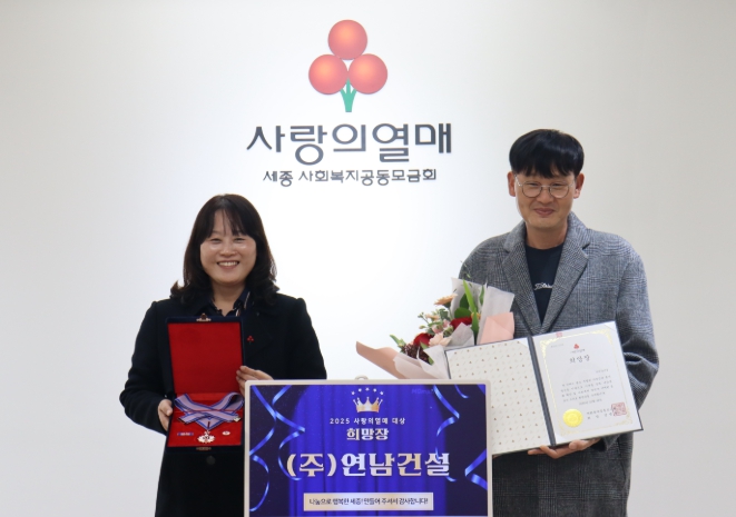 [뉴스노크=김인호 기자] ㈜연남건설(대표 박성윤)은 사회복지공동모금회가 주최하는 ‘2025년 제12회 사랑의열매 대상’에서 기부분야 ‘희망장’을 수여해 전달식을 가졌다고 세종사회복지공동모금회(회장 박상혁)에서 전했다.
