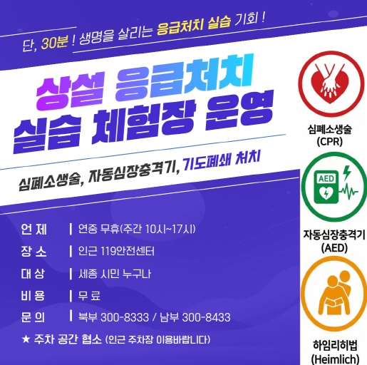 [뉴스노크=김인호 기자] 세종소방본부가 오는 23일부터 관내 모든 119안전센터에 상설 응급처치 실습 체험장을 운영한다.