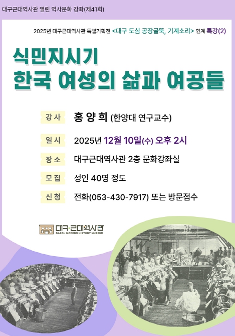[뉴스노크=김인호 기자] (재)대구문화예술진흥원 박물관운영본부 소속 대구근대역사관은 '대구 도심 공장굴뚝, 기계소리 -근대 대구 섬유 읽기-' 특별기획전과 연계해 12월 10일 오후 2시에 ‘식민지시기 한국 여성의 삶과 여공들’을 주제로 제41회 열린 역사문화 강좌를 개최하며, 참가자를 모집한다.