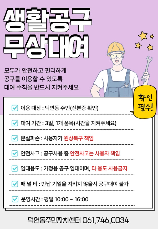 [뉴스노크=김인호 기자] 순천시 덕연동 주민자치회(회장 장성욱)는 주민들의 생활 편의를 높이고 공유 및 나눔 문화 확산을 위해 오는 8일부터 ‘생활공구 무상대여 사업’을 운영한다고 밝혔다.