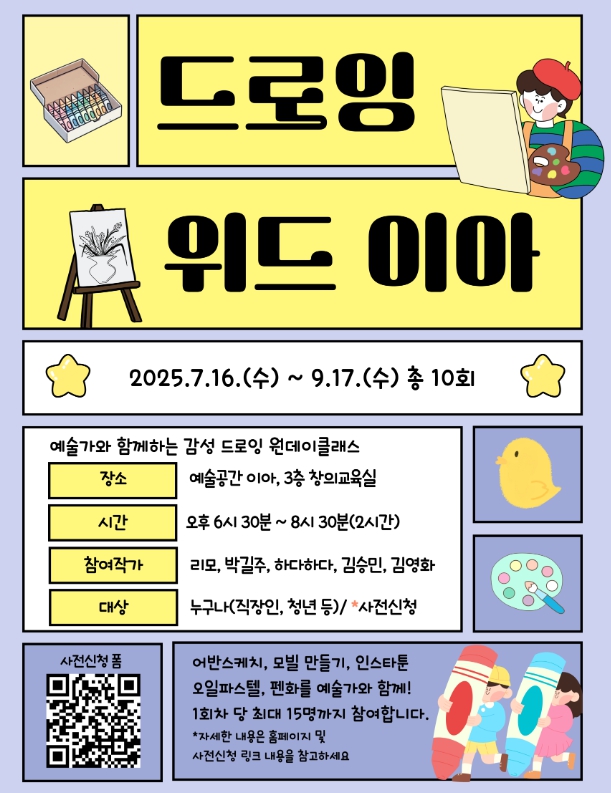 [뉴스노크=김인호 기자] 제주문화예술재단(이사장 김석윤)은 오는 7월 16일부터 9월 17일까지 제주 지역 작가들과 함께하는 원데이 아트 클래스 '드로잉 위드 이아'를 예술공간 이아에서 운영한다.