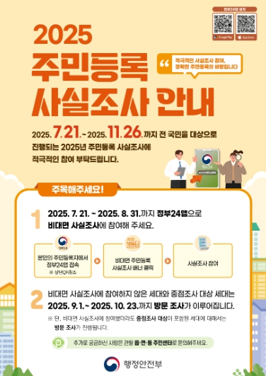 [뉴스노크=김인호 기자] 과천시는 이달 21일부터 10월 23일까지 ‘2025년 주민등록 사실조사’를 실시한다고 밝혔다. 이번 조사는 7월 21일부터 8월 31일까지 ‘정부24’ 모바일 앱을 활용한 비대면-디지털 조사로 시작되며, 이후 9월 1일부터 10월 23일까지 통장과 동 주민센터 공무원이 거주지에 직접 방문하는 방문 조사가 진행된다.