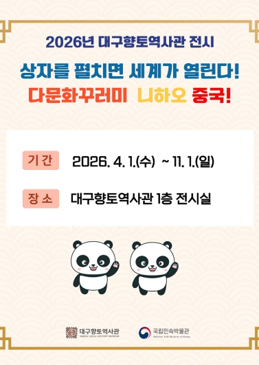 [뉴스노크=김인호 기자] 대구문화예술진흥원 박물관운영본부 소속 대구향토역사관은 국립민속박물관이 주관하는 ‘2026 다문화꾸러미 대여 운영’ 공모사업에 선정되어, 올해 중국 다문화꾸러미를 활용한 다양한 사업을 운영한다.