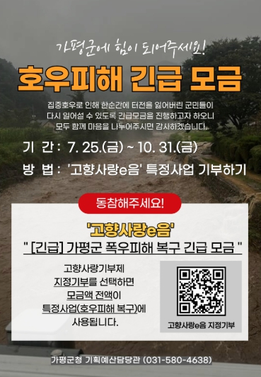 가평군 관계자는 “삶의 터전을 잃은 군민들을 위한 복구가 시급한 상황”이라며 “고향사랑기부제를 통해 실질적인 연대와 온정이 모일 수 있도록 많은 관심과 참여를 부탁드린다”고 말했다.