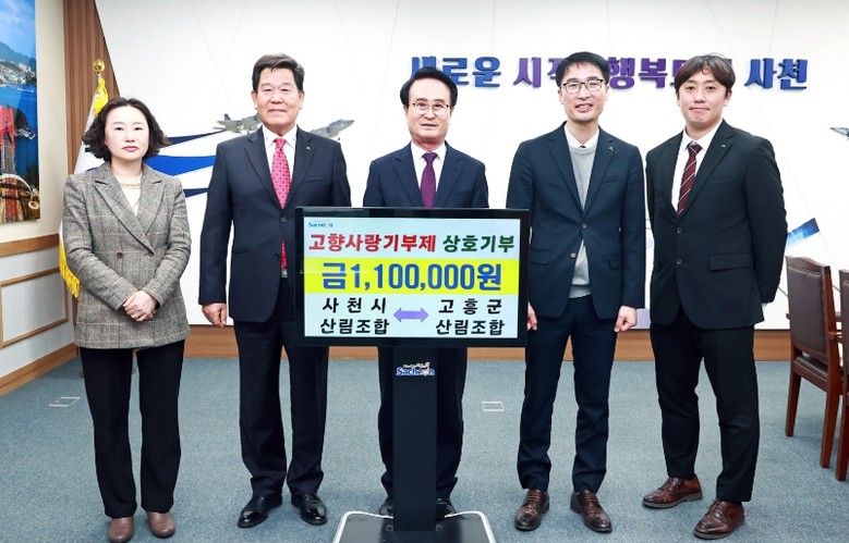 지난 26일 김근배 사천시산림조합장, 조준필 고흥군산림조합 지도상무 등 양 산림조합 임직원들이 사천시청을 방문해 고향사랑기부금 110만 원을 상호 기부하고, 지역 사랑 실천을 위한 교류의 시간을 가졌다.