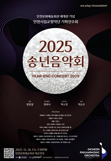 [뉴스노크=김인호 기자] 인천시립교향악단이 한 해의 마지막을 화려하게 장식할 인천문화예술회관 재개관 기념 기획연주회 〈2025 송년음악회〉의 프로그램과 티켓 예매 일정을 전격 공개했다.