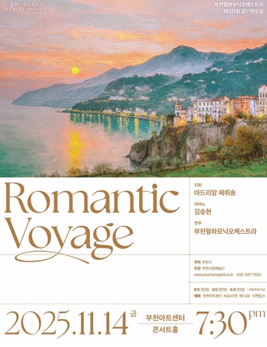 [뉴스노크=김인호 기자] 부천필하모닉오케스트라가 오는 11월 14일 오후 7시 30분 부천아트센터 콘서트홀에서 제331회 정기연주회 'Romantic Voyage'를 개최한다. 공연에는 상임지휘자 아드리앙 페뤼숑과 부천필이 무대에 오르며, 협연자로는 탁월한 음악적 이해력과 구성력으로 호평받는 피아니스트 김송현이 ‘낭만적 여정’에 함께 오른다.