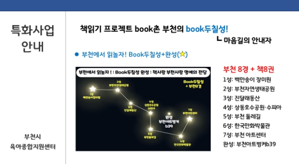 한편, 센터는‘BOOK촌 부천의 BOOK두칠성! 공모전’을 개최하여 부천시 관내 어린이집을 대상으로 영유아 독서 실천 우수사례를 공모하고 있다. 공모작은 2025년 11월 14일까지 접수하여 우수사례를 선정, 시상하고 사례 공유하여 지역사회 내 독서문화 확산의 마중물로 활용할 계획이다.