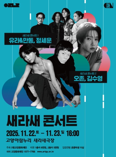 [뉴스노크=김인호 기자] (재)고양문화재단은 소극장 기획공연 시리즈 ‘2025 새라새 ON 시리즈’의 11월 프로그램으로, 감각적인 싱어송라이터들을 만날 수 있는 '새라새 콘서트 1~2'를 11월 22일과 23일 양일간 고양아람누리 새라새극장에서 개최한다.