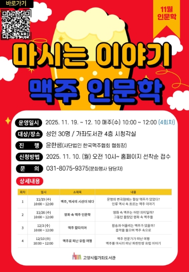 [뉴스노크=김인호 기자] 고양특례시 가좌도서관은 11월 19일부터 12월 10일까지 맥주를 키워드로 한 인문학 프로그램 ‘마시는 이야기, 맥주 인문학’을 운영한다.