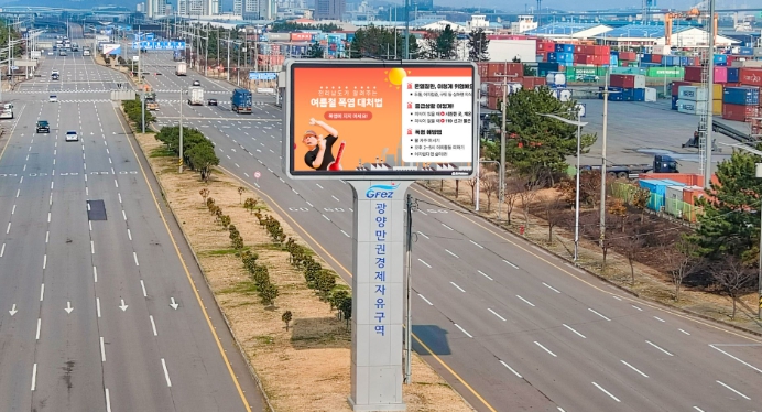 [뉴스노크=김인호 기자] 광양만권경제자유구역청은 여름 휴가철에 맞춰 광양항 인근 대형 홍보 전광판을 활용한 여름철 안전 및 생활정보 홍보를 강화하고 있다고 밝혔다.