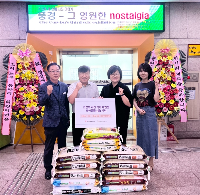 ▲ 사진 개인전 축하화환 대신 받은 쌀 240kg 기탁 |