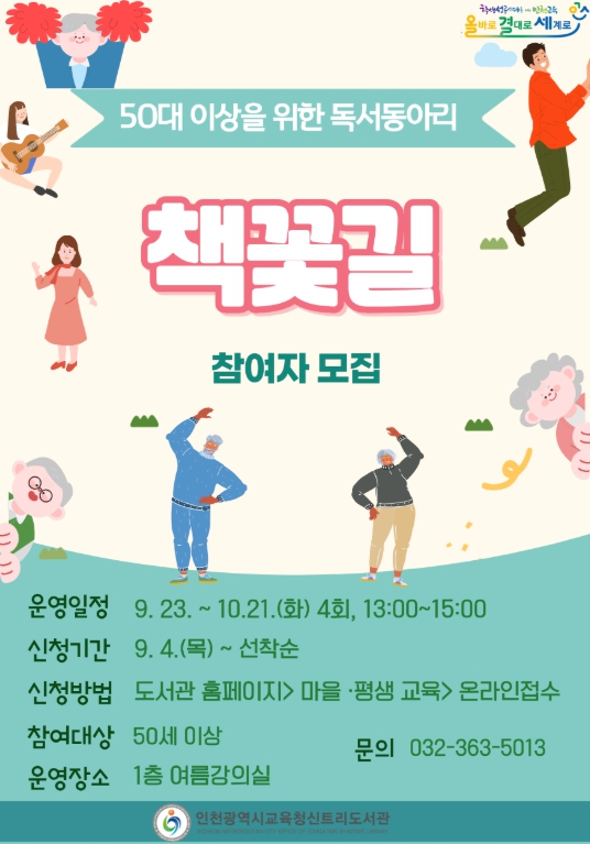 [뉴스노크=김인호 기자] 인천광역시교육청신트리도서관은 50대 이상 시민을 대상으로 책을 통한 소통과 정서적 유대감 형성을 위한 ‘책꽃길’ 독서동아리를 오는 9월 23일부터 10월 21일까지 매주 화요일 총 4회 운영한다.