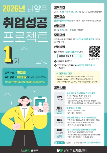 [뉴스노크=김인호 기자] 남양주시는 오는 26일부터 청년 구직자의 취업 경잭력 강화를 위해 ‘2026 취업성공 프로젝트 1기’참여자를 모집한다고 밝혔다.
