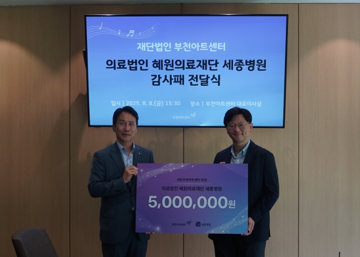 [뉴스노크=김인호 기자] 부천아트센터는 지난 8월 8일 의료법인 혜원의료재단 세종병원(이사장 박진식)으로부터 부천시 문화예술 발전을 위한 기부금 500만 원을 전달받았다고 밝혔다.