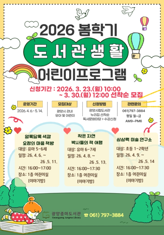 [뉴스노크=김인호 기자] 광양중마도서관은 오는 4월 6일부터 5월 14일까지 6주간 유아(5~7세)와 초등학교 1~2학년을 대상으로 봄 학기 어린이 프로그램에 참여할 수강생을 모집한다고 밝혔다.