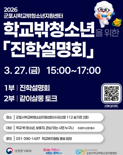 [뉴스노크=김인호 기자] 군포시청소년재단 군포시학교밖청소년지원센터는 오는 2026년 3월 27일 학교 밖 청소년과 보호자 등을 대상으로 진학설명회를 개최한다.