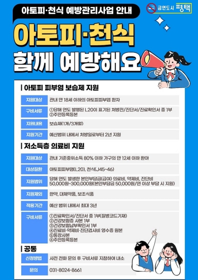 이에, 안중보건지소는 서부지역 내 아토피 피부염 환아(만 18세 이하)에게 2년간 연 4회 보습제를 지원하고 있으며, 기준중위소득 80% 이하 저소득층 가구의 아토피 피부염 또는 천식 질환이 있는 환아(만 12세 이하)에게는 의료비를 지원하고 있다.
