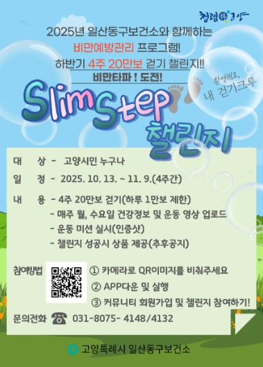 [뉴스노크=김인호 기자] 고양특례시 일산동구보건소는 지역주민의 비만예방과 신체활동 증진을 위해 오는 10월 13일부터 11월 9일까지 4주간 20만보 걷기‘ Slim Step 챌린지’를 운영한다고 밝혔다.