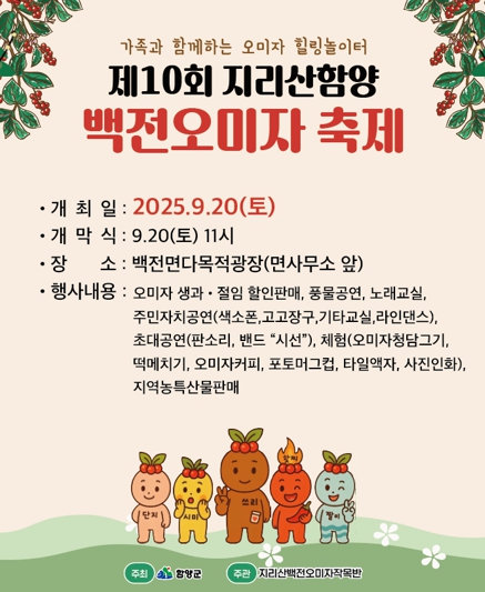 [뉴스노크=김인호 기자] 함양군 백전면에서 지역 대표 특산물인 오미자를 주제로 한 '제10회 지리산함양백전오미자축제'가 오는 9월 20일, 백전면 다목적광장에서 개최된다.