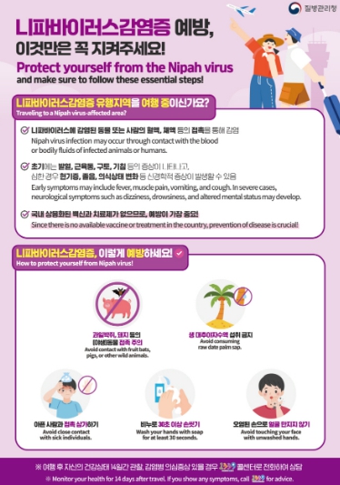 감염 예방을 위해서는 △비누로 30초 이상 손 씻기 △과일박쥐, 돼지 등 야생동물과의 접촉 피하기 △생 대추야자수액 등의 음료, 바닥에 떨어진 과일 섭취 자제 △환자와의 직접 접촉 피하기 등의 수칙을 지켜야 한다.