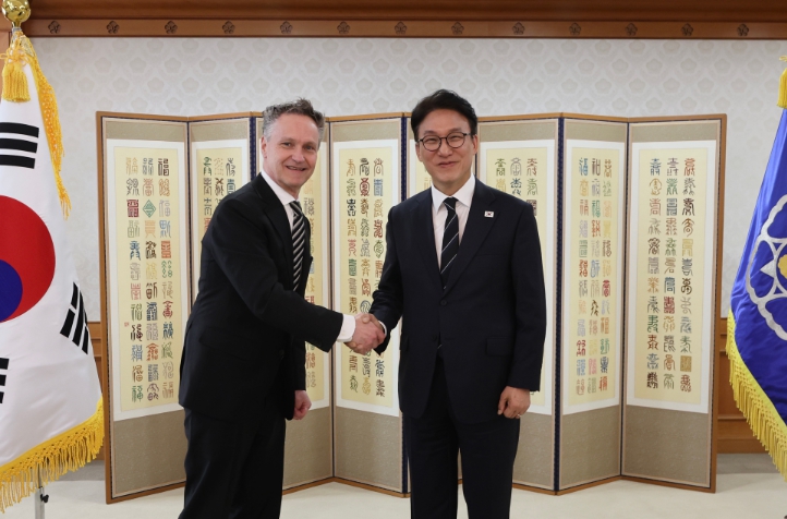 | ▲ 김민석 국무총리가 9일 세종대로 정부서울청사에서 패트릭 존슨 일라이릴리앤컴퍼니 인터내셔널사업 총괄 대표를 접견, 인사 및 환담을 나누고 있다. |