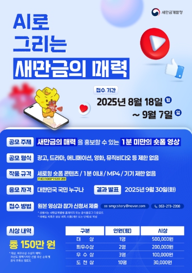[뉴스노크=김인호 기자] 새만금개발청은 새만금의 다양한 매력을 인공지능(AI) 기술로 활용해 담아내는 ‘2025년 새만금 인공지능(AI) 숏폼(짧은 영상) 공모전’을 8월 18일부터 9월 7일까지 개최한다.