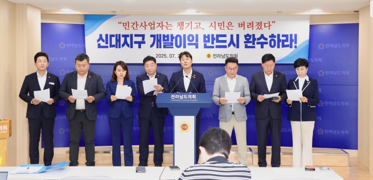 [뉴스노크=김인호 기자] 전라남도의회 순천지역 의원들은 7월 28일 공동성명을 통해 “순천 신대지구 개발을 통해 민간사업자는 천문학적인 이익을 챙겼지만 정작 순천시민에게 돌아온 것은 아무것도 없다”며, “광양경제자유구역청과 순천시는 즉각 개발이익 환수에 나서야 한다”고 촉구했다.