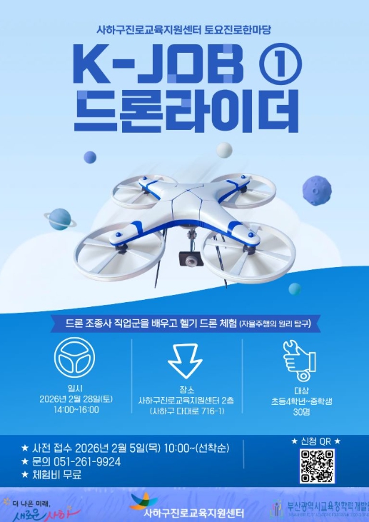 이번 프로그램은 K-JOB 드론 라이더 직업군에 대해 알아보고, 헬기 드론을 활용한 자율주행 원리를 체험·탐구해 보는 시간으로 2월 28일 토요일 오후 2시부터 사하구진로교육지원센터 2층에서 진행된다.