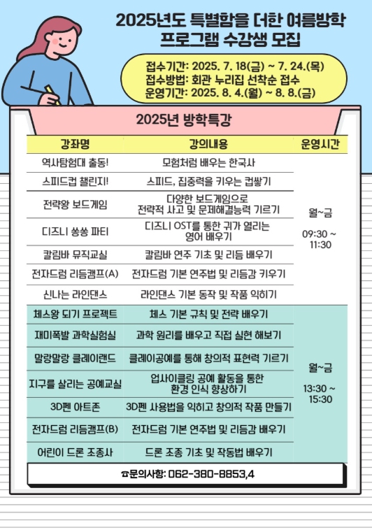 [뉴스노크=김인호 기자] 광주시교육청학생교육문화회관은 오는 8월 4~8일 ‘2025년도 특별함을 더한 여름방학 프로그램’을 운영한다.