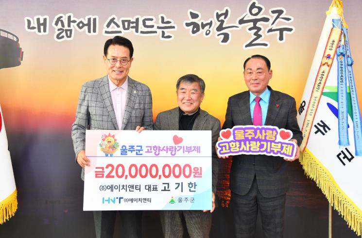 [뉴스노크=김인호 기자] 고기한 ㈜에이치앤티 대표가 3일 울주군에 고향사랑기부금 연간 최고액인 2천만원을 전달하면서 4년째 고향사랑을 실천하고 있다.