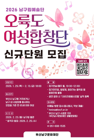[뉴스노크=김인호 기자] (재)부산남구문화재단은 남구립 오륙도여성합창단의 2026년 신규 합창단원을 1월 29일부터 2월 13일까지 공개 모집한다고 밝혔다.