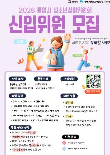 [뉴스노크=김인호 기자] 통영시는 관내 청소년을 대상으로 오는 15일까지 ‘2026년 통영시 청소년참여위원회’위원을 모집한다.