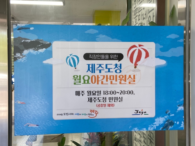 제주도는 평일 주간 방문이 어려운 직장인과 학생 등의 행정서비스 접근성을 높이기 위해 매주 월요일(공휴일 제외) 오후 6시부터 8시까지 ‘제주도청 월요야간민원실’을 운영하고 있다.