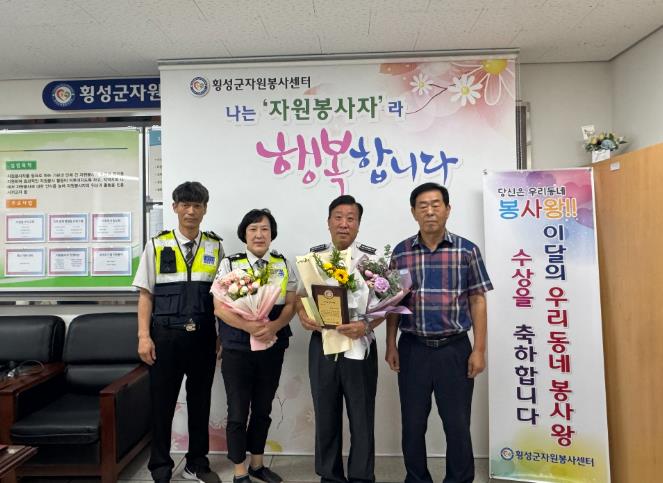 [뉴스노크=김인호 기자] 횡성군자원봉사센터는 7월 우리동네 봉사왕(횡성읍)으로 개인 부문에 홍근표 씨, 단체 부문에 횡성읍 자율방범대를 선정하고, 16일 자원봉사센터 사무실에서 “우리동네 봉사왕 시상식”을 열었다.