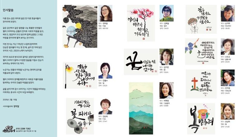 한편, 이번 전시를 준비한 주민 작가들은 지난 1년여 동안 복합문화공간 ‘서이 아뜰리에’에서 함께 멋글씨(캘리그래피) 쓰기 수업을 들으며 영감을 나누고 나아가 멋글씨(캘리그래피)의 경계를 확장하며 새로운 가능성을 모색해 왔다.