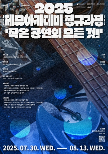 [뉴스노크=김인호 기자] 문화체육관광부, 한국콘텐츠진흥원, 제주특별자치도, 그리고 (재)제주콘텐츠진흥원(원장 강민부)이 공동 추진하는 2025 제주음악창작소 운영사업의 일환으로, '제뮤아카데미 정규과정 – 작은 공연의 모든 것!'이 오는 8월 23일부터 31일까지 제주에서 본격 운영된다.