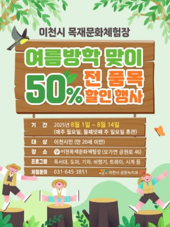 [뉴스노크=김인호 기자] 이천시는 여름방학을 맞아 어린이 및 청소년들에게 특별한 체험 기회를 제공하기 위해 목재문화체험장 이용료를 50%할인하는 행사를 진행한다고 밝혔다.
