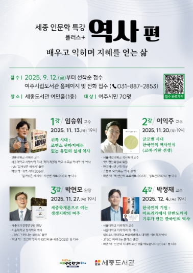 [뉴스노크=김인호 기자] 여주시는 오는 11월 13일부터 12월 4일까지 세종도서관 여민홀(1층)에서 '세종 인문학 특강 플러스+' ‘역사 편’을 4회 운영한다.
