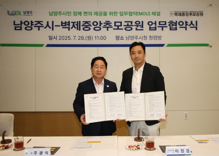 [뉴스노크=김인호 기자] 남양주시는 28일 시청 청렴방에서 벽제중앙추모공원과 시민 장사(葬事)복지 향상 및 장례 편의 개선을 위한 업무협약(MOU)을 체결했다.